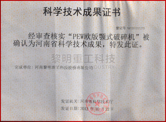- PEW歐版顎式破碎機(jī)獲河南省科學(xué)技術(shù)成果 >>查看證書