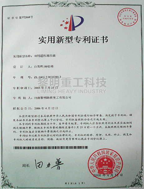 - 上擺式輥磨機(jī)專利號:ZL 200620031045.6 >>查看證書
