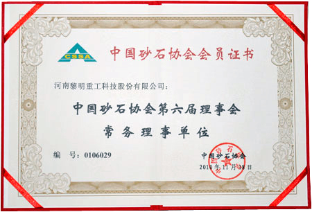 公司一直是中國(guó)砂石協(xié)會(huì)理事單位,眾多產(chǎn)品經(jīng)廣泛的市場(chǎng)應(yīng)用,贏得了國(guó)內(nèi)外客戶的普遍贊譽(yù),被中國(guó)砂石協(xié)會(huì)確定為推薦設(shè)備。本屆再次由新?lián)Q屆的中國(guó)砂石協(xié)會(huì)推薦為常務(wù)理事單位,表現(xiàn)了中國(guó)砂石協(xié)會(huì)對(duì)黎明重工科技產(chǎn)品質(zhì)量的充分認(rèn)可。