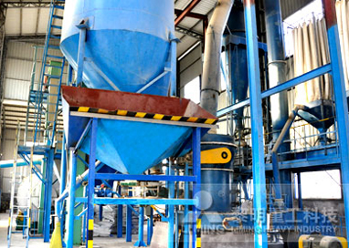 當方解石進入磨腔后,由鏟刀鏟起送入磨輥與磨環(huán)之間進行碾壓,碾壓后的方解石粉隨鼓風機的循環(huán)風帶入分析機,合格細粉隨氣流進入旋風集粉器收集即為成品,大顆粒物粒落回重磨。循環(huán)風返回鼓風機再重復以上過程,余風則進入袋式除塵器凈化。當磨輥與磨環(huán)達到一定磨損后,調(diào)整高壓彈簧長度,保持磨輥與磨環(huán)之間恒定碾壓力。從而保證方解石穩(wěn)定的產(chǎn)量與細度。