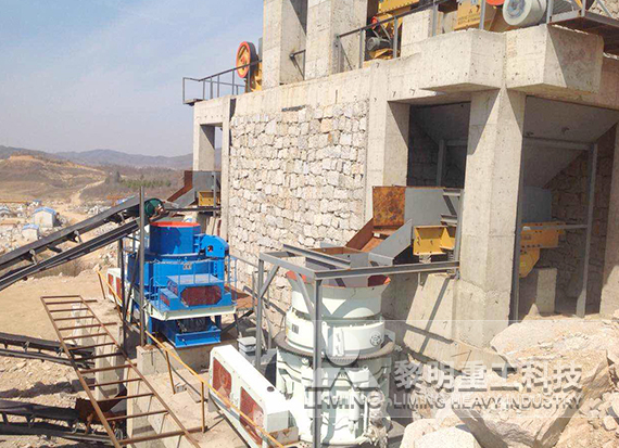 大塊物料經(jīng)過GZD1500×6000振動(dòng)給料機(jī)被均勻的送進(jìn)HJW145高能顎破中進(jìn)行粗碎;粗碎后的物料經(jīng)過兩臺(tái)GZD960×3800振動(dòng)給料機(jī)進(jìn)入兩臺(tái)HJ98高能顎破中進(jìn)行中碎;中碎后的物料經(jīng)過兩臺(tái)GZD960×3800振動(dòng)給料機(jī)均勻的喂入兩臺(tái)HPT300多缸液壓圓錐破進(jìn)行細(xì)碎;細(xì)碎后的物料經(jīng)過三臺(tái)YZS2160振動(dòng)篩分級(jí)后,10-25mm成為骨料產(chǎn)品,25mm以上的返回HPT300多缸液壓圓錐破循環(huán)破碎,0-10mm的物料進(jìn)入VSI9526沖擊破進(jìn)行整形,產(chǎn)出0-5mm的成品機(jī)制砂。