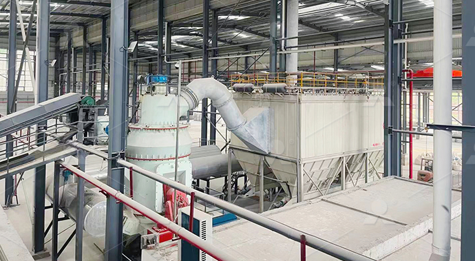 第二階段:磨粉破碎后的重晶石小塊物料經(jīng)提升機(jī)送至料倉(cāng),再經(jīng)振動(dòng)給料機(jī)將其均勻定量的送入磨機(jī)研磨室內(nèi)進(jìn)行研磨。