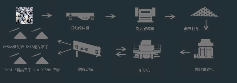 大塊石料經(jīng)料倉(cāng)由振動(dòng)給料機(jī)均勻地送進(jìn)顎式破碎機(jī)中粗碎,產(chǎn)出的粗料由皮帶輸送機(jī)輸送至液壓圓錐式破碎機(jī)細(xì)碎,細(xì)碎后的石料進(jìn)入制砂機(jī)整形,由振動(dòng)篩篩分出不同規(guī)格的砂石料。