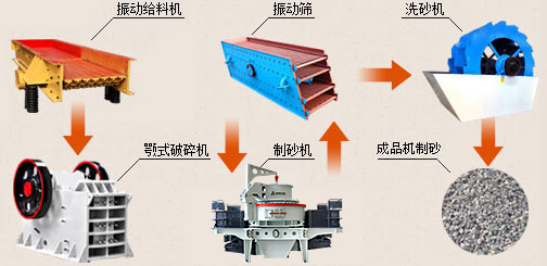機(jī)制砂生產(chǎn)由原料預(yù)處理系統(tǒng)、計(jì)量中控系統(tǒng)、粉合系統(tǒng)、包裝系統(tǒng)、收塵系統(tǒng)五大系統(tǒng)組成,采用干法生產(chǎn)工藝,包括給料、碎石與機(jī)制砂整形、級(jí)配調(diào)整、篩分、砂粉分離、粉塵收集、輸送、電氣控制等工作模塊,主要設(shè)備包括GZD振動(dòng)給料機(jī)、PE顎式破碎機(jī)、5X制砂機(jī)、XSD洗砂機(jī)、MC除塵器、YZS振動(dòng)篩、KX選粉機(jī)、B皮帶輸送機(jī)、砂石粉分離機(jī)、電控系統(tǒng)等,可以對(duì)入料尺寸為50mm以下各種巖石顆粒進(jìn)行加工整形,獲得符合一定比例要求和相關(guān)質(zhì)量要求的精品碎石和精品機(jī)制砂。