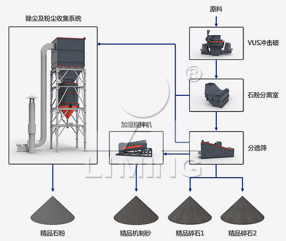 原料通過斗提機(jī)被送入頂樓,由原料輸送皮帶將0~40mm的碎石送入VUS沖擊破,經(jīng)過高頻石打石研磨后進(jìn)入石粉分離室,通過調(diào)整控粉箱進(jìn)風(fēng)口大小和系統(tǒng)風(fēng)量來調(diào)節(jié)制砂含粉量;處理后的物料進(jìn)入分選篩內(nèi)分選出精品碎石、石粉及準(zhǔn)成品砂。其中石粉通過除塵及粉塵收集系統(tǒng)處理后收集為精品石粉,準(zhǔn)成品砂通過加濕攪拌機(jī)均勻拌合后即為精品機(jī)制砂。 經(jīng)VUS砂石同出系統(tǒng)處理后,能夠產(chǎn)出級配合理、粒型圓潤、含粉量可控的精品粗細(xì)骨料(碎石、機(jī)制砂),以及干燥潔凈、可進(jìn)行統(tǒng)一回收利用的高附加值石粉(根據(jù)原料決定可應(yīng)用范圍)。