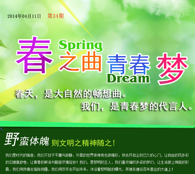 我們是時(shí)代的強(qiáng)音,我們不甘于平庸與寂靜,外面的世界很神奇也很精彩,快去開(kāi)啟塵封已久的心門,讓自由的風(fēng)多彩的云隨意舒卷,讓青春的鮮活與靚麗盡情綻放!我們,是黎明的主人,我們喜歡編織多姿的夢(mèng)幻,讓生活披上絢麗的彩霞,我們用熱情去驅(qū)除陰霾,我們用雙手去開(kāi)創(chuàng)未來(lái),沐浴著黎明前的曙光,奔馳在建設(shè)百年基業(yè)的大道上!