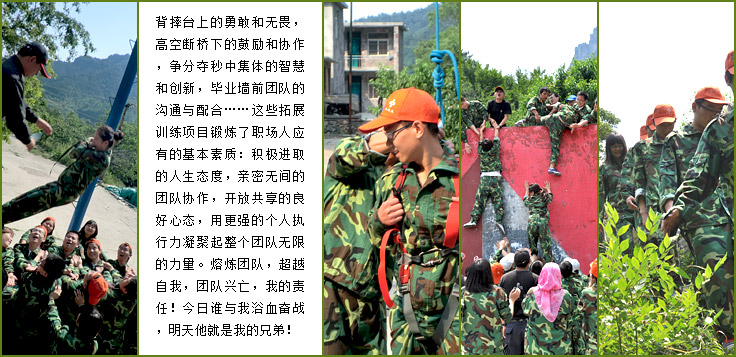 背摔臺(tái)上的勇敢和無(wú)畏,高空斷橋下的鼓勵(lì)和協(xié)作,爭(zhēng)分奪秒中集體的智慧和創(chuàng)新,畢業(yè)墻前團(tuán)隊(duì)的溝通與配合……這些拓展訓(xùn)練項(xiàng)目鍛煉了職場(chǎng)人應(yīng)有的基本素質(zhì):積極進(jìn)取的人生態(tài)度,親密無(wú)間的團(tuán)隊(duì)協(xié)作,開(kāi)放共享的良好心態(tài),用更強(qiáng)的個(gè)人執(zhí)行力凝聚起整個(gè)團(tuán)隊(duì)無(wú)限的力量。熔煉團(tuán)隊(duì),超越自我,團(tuán)隊(duì)興亡,我的責(zé)任!今日誰(shuí)與我浴血奮戰(zhàn),明天他就是我的兄弟!