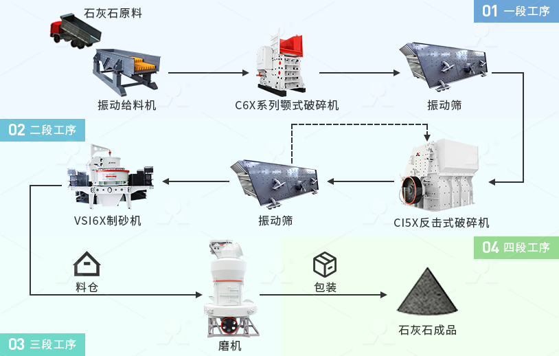 石灰石或石灰?guī)r資源豐富,原礦品位一般能滿足各工業(yè)部門(mén)的要求。因此,一般只需要進(jìn)行簡(jiǎn)單的洗礦,不需要采用復(fù)雜的選礦工藝進(jìn)行提純。石灰石的加工主要是粉碎、分級(jí)以及生產(chǎn)生石灰、熟石灰、沉淀碳酸鈣、超微細(xì)(納米)碳酸鈣、二氧化碳等。石灰石一般采用干式粉碎工藝,對(duì)于冶金、道路用石灰石,將礦石破碎篩分后即可。對(duì)于細(xì)粉產(chǎn)品的生產(chǎn),礦石經(jīng)顎式破碎機(jī)、反擊式破碎機(jī)或圓錐式破碎機(jī)等破碎后直接用雷蒙磨粉磨,產(chǎn)品細(xì)度100-325目,具體加工流程如下: