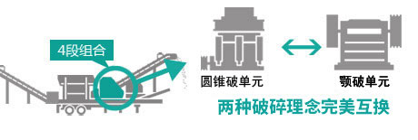 一種車身為8種機型通用,喂料單元互換系統(tǒng)、破碎單元互換系統(tǒng)和篩分單元互換系統(tǒng),只需再投資單機設備成本,短時間內,即可在同一車身上實現(xiàn)不同型號喂料單元、破碎單元和篩分單元互換系統(tǒng),整機各系統(tǒng)之間的準確匹配,適應場合更廣泛,破碎功能更優(yōu)良,客戶的消費品得到增值。