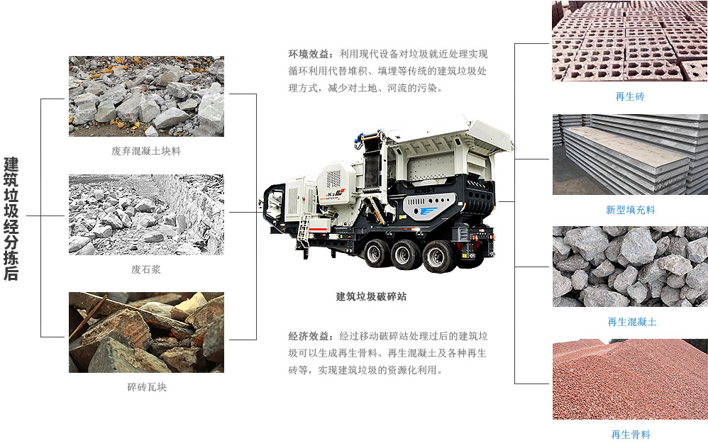 黎明重工針對建筑垃圾處理,秉承環(huán)保理念,憑借豐富的礦山機械研發(fā)經驗與技術支撐推出了移動破碎站組合設備,對建筑垃圾中的廢物進行分揀、剔除或者破碎,使之作為再生資源被重新利用,構建城市文明!