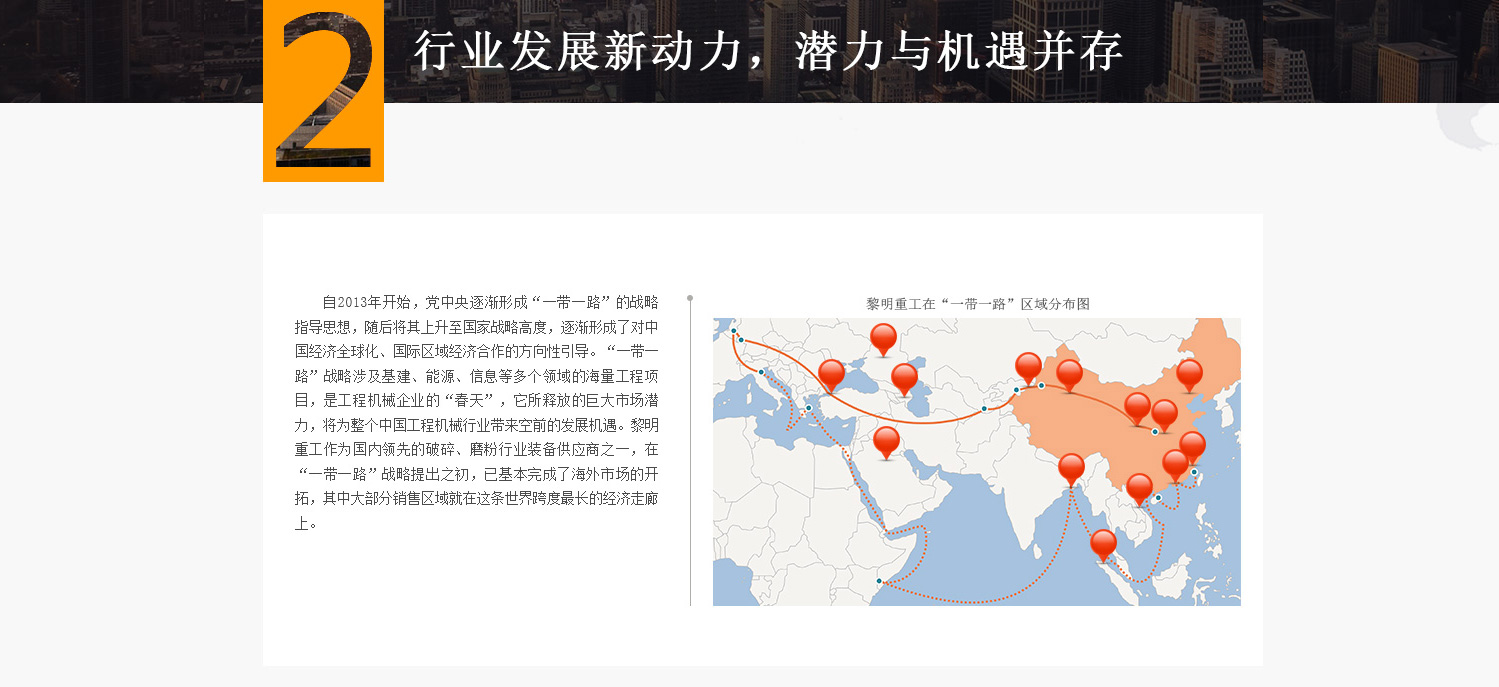 自2013年開始,黨中央逐漸形成“一帶一路倡議”的戰(zhàn)略指導(dǎo)思想,隨后將其上升至國(guó)家戰(zhàn)略高度,逐漸形成了對(duì)中國(guó)經(jīng)濟(jì)全球化、國(guó)際區(qū)域經(jīng)濟(jì)合作的方向性引導(dǎo)。“一帶一路倡議”戰(zhàn)略涉及基建、能源、信息等多個(gè)領(lǐng)域的海量工程項(xiàng)目,是工程機(jī)械企業(yè)的“春天”,它所釋放的巨大市場(chǎng)潛力,將為整個(gè)中國(guó)工程機(jī)械行業(yè)帶來發(fā)展機(jī)遇。黎明重工作為國(guó)內(nèi)知名的破碎、磨粉行業(yè)裝備供應(yīng)商之一,在“一帶一路倡議”戰(zhàn)略提出之初,已基本完成了海外市場(chǎng)的開拓,其中大部分銷售區(qū)域就在這條世界跨度最長(zhǎng)的經(jīng)濟(jì)走廊上。