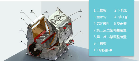 機架部分、轉子部分、反擊架、翻蓋裝置傳動部分組成。工作時,電機高速旋轉帶動轉子做高速運動。當物料由入料口進入機器時,受到轉子上的板錘高速撞擊而被破碎,然后被拋到反擊襯板上再次破碎,之后又從反擊襯板上彈回到板錘作用區(qū)重新破碎。在此過程中,物料之間也相互撞擊,達到破碎的效果。此過程重復進行,直到物料被破碎至所需粒度,由出料口排出。